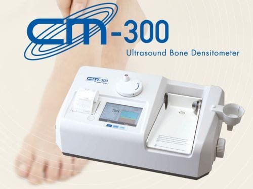 Ultrasound Bone Densitometer CM-300 measures bone density of human heel using ultrasound. The result is printed out with graph format chart from a built-in printer. Also adjustable Foot Plate (5 levels) and Temperature Compensation feature provides accurate results. With easy-to-use interface of the color touch screen, CM-300 is most suitable for screening test of osteoporosis.
